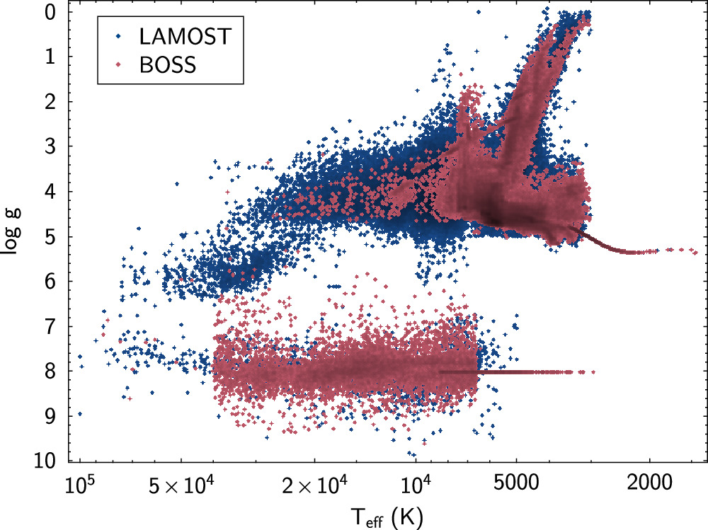 BOSSNet determines stellar parameters for BOSS spectra using a 1D residual convolutional network. For a complete description, please see Sizemore et al. (2024). The model was trained on both BOSS and LAMOST spectra, interpolated onto a common 3900 element wavelength grid ranging uniformly from 3800 to 8900 Å, approximating the typical resolution of the data within that range. The LAMOST data were used to ensure that sufficient labels were available across the HR diagram, as the MWM BOSS data currently has limited overlap with APOGEE and other datasets with well-determined stellar parameters.