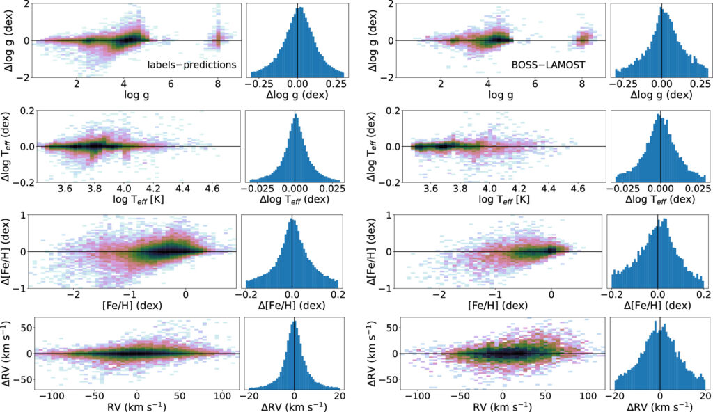 BOSS Net is evaluated with the mean squared error between the predicted and actual values. To encourage accurate modeling of the less populated regions of the parameter space, the loss of stars was adjusted, either by increasing or decreasing their weight in the loss calculation during training. The weight of specific regions is determined by the reciprocal of the Kernel Density Estimation (KDE) values computed from the training labels. This allows the model to prioritize the learning of less common samples, as indicated by their low-density regions in the KDE estimation, while reducing the impact of well-modeled samples, which are associated with high-density regions. As shown in Figure 5, the white dwarfs and the hot subdwarfs are weighted higher in the loss calculation, as they are in less dense regions of the parameter space. In addition, [Fe/H] of metal-poor stars is weighted higher in comparison to the metal-rich stars, and RVs of WDs or stars with RV > 200 km s−1 are weighed higher than for other sources, once again due to their rarity in the sample. The model was trained with a learning rate of 0.0001 using the Adamax optimizer (which is more robust to the presence of outliers; Kingma & Ba 2014), and a batch size of 512.
