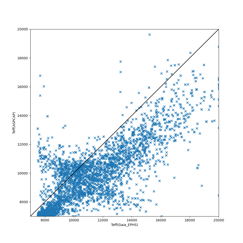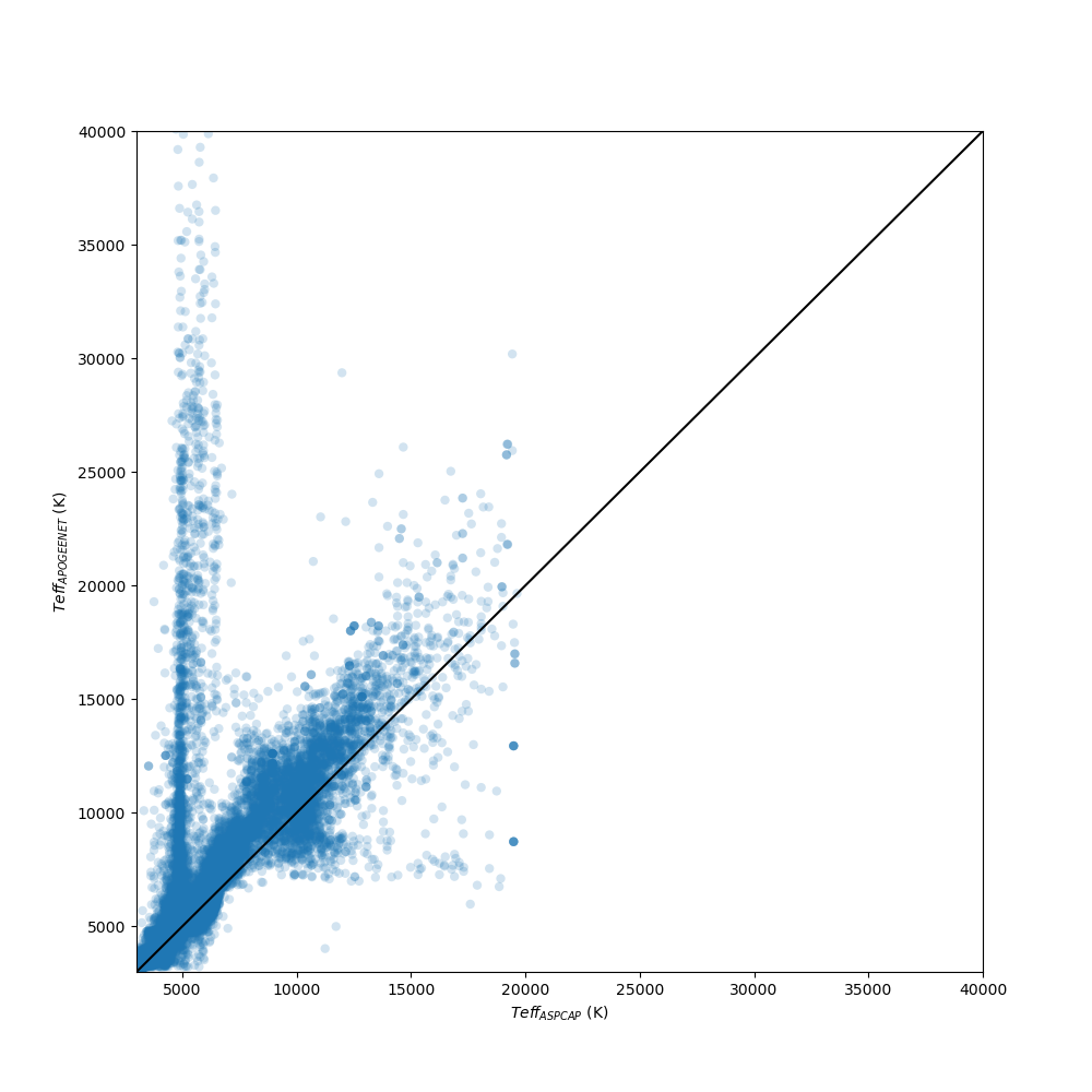 For stellar parameters from APOGEE spectra, we recommend in general the ASPCAP parameters for stars with Teff < 20,000 K, in part because ApogeeNet does not report [Fe/H] values for hotter stars because of concerns about the accuracy of the labels. We note that the ApogeeNet Teff agree better with the Gaia Extended Stellar Parameterizer for Hot Stars (ESP-HS) temperatures than do the ASPCAP Teff. (Figure 2) The ASPCAP grid does not extend beyond 20,000K, so at higher temperatures, only the ApogeeNet parameters are available.