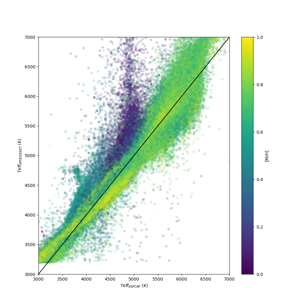 For one example, in Figure 1 (left) we show the comparison of ASPCAP and ApogeeNet temperatures, excluding all stars with flag_bad set for either pipeline. While most of the stars hotter than 20,000 K are flagged as bad in ASPCAP because of hitting the 20,000K grid edge, some stars survive as the plume of stars with low (~5000K) ASPCAP temperatures and high ApogeeNet temperatures. Figure 1 (right) zooms in on this region and color codes the stars by ASPCAP metallicity. We see that these stars are identified as very metal-poor in ASPCAP. As cool very metal-poor stars and very hot stars both are fairly featureless in the H-band, it is clear that ASPCAP found a local minimum at the incorrect value for these stars. Comparing the Teff between ASPCAP and ApogeeNet or considering Gaia XP spectra or other photometric information or looking at the spectrum would catch these rare missteps. We are working on improving flagging and stellar parameter derivation for future data releases, but please be aware that the stellar parameters are not perfect.